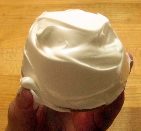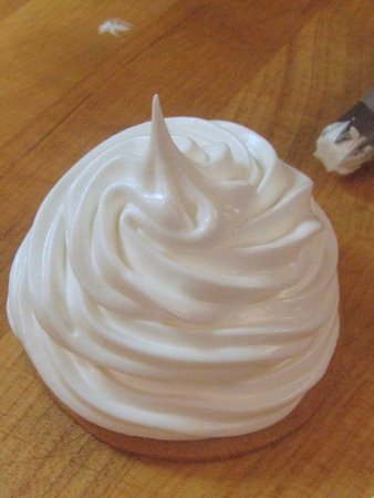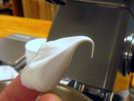 I like these medium-stiff peaks best. You get the nicely formed peaks, but also a bit of softness at the points that will toast up beautifully.