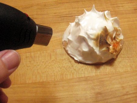 If you don't have a cook's torch you can borrow your spouse's blowtorch from the basement (that's actually what they use in most restaurants) or you can place a tray of Baked Alaskas under the broiler for about 3 minutes or until golden browned.