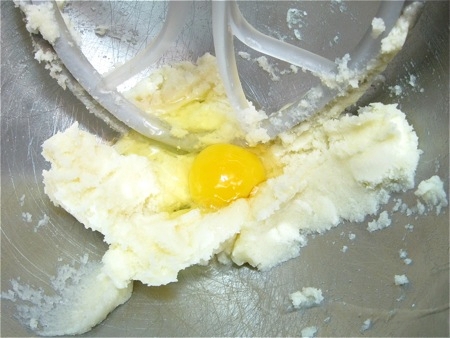Next, beat together 8 tablespoons (113g) butter and 2/3 cup (131g) sugar till smooth. Add 1 large egg.
