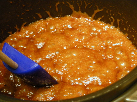 Bring the caramel mixture to a boil. Stirring occasionally, boil the syrup for 5 minutes. The syrup will darken slightly as the bubbles roil and murmur.