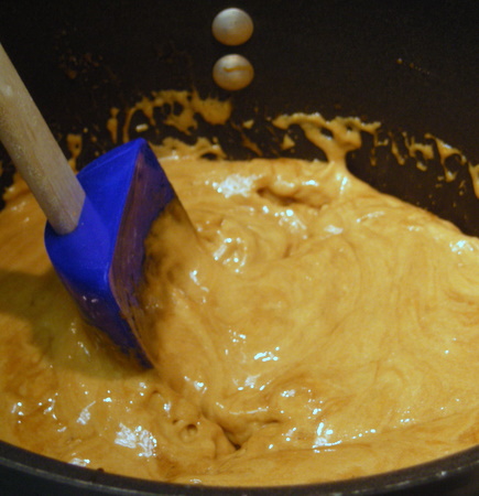 As you stir in the soda, the caramel will thicken and change color, becoming a rich golden beige. It will appear almost airy at this point. If you've ever had molasses puff candy you'll recognize the look in this caramel.