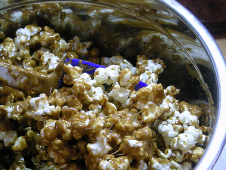 Immediately pour the hot caramel over the popped corn and stir constantly to coat the kernels in caramel. Again, use caution as the syrup is very hot and will stick to skin in a flash. If the kids are helping, leave this part up to the grownups.