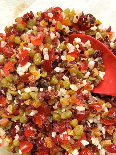 Thus, each year when I make fruitcake, I eschew those two ingredients in favor of more delectable (to my mind) dried fruits: candied cherries, apricots, golden raisins, tangy pineapple, sweet dates, flavorful cranberries...