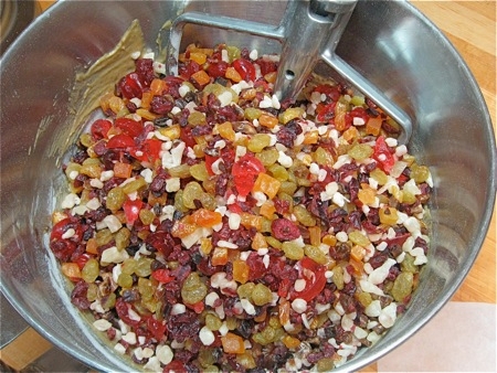 Stir in 3 pounds or 9 cups (1361g) of chopped dried fruit; smaller fruits, such as raisins, can be left whole. Here I've used a combination of our favorite fruitcake fruit blend; and chopped candied red cherries.