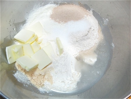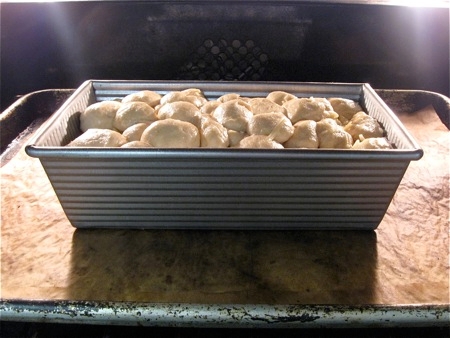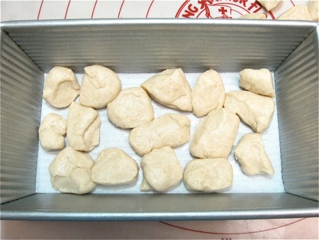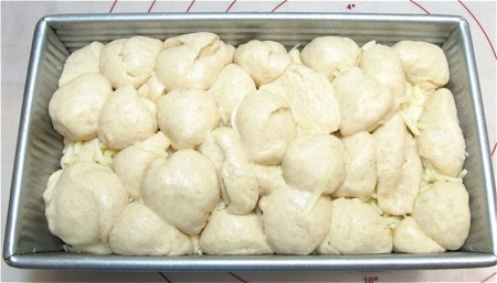 Place 16 dough pieces in the bottom of the pan, putting them close together.