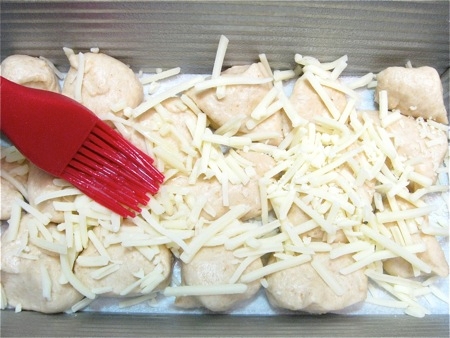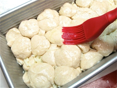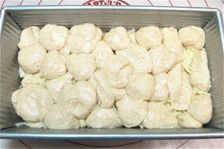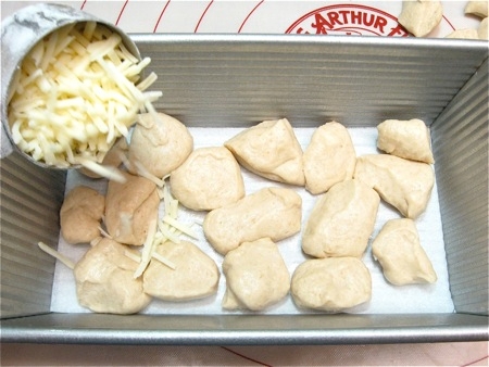 Place another 16 pieces of dough atop the first layer. Sprinkle with 1/3 cup cheese, and drizzle or brush with some more of the melted butter. Repeat with the remaining pieces of dough, making two more layers. Brush the top layer with butter, but don't sprinkle with cheese; that'll be added after the loaf is baked.