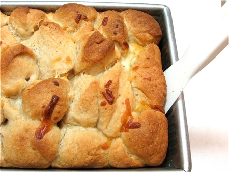 The following bread is much more refined. A savory version of monkey or pull-apart bread, it divides daintily into two-bite pieces.