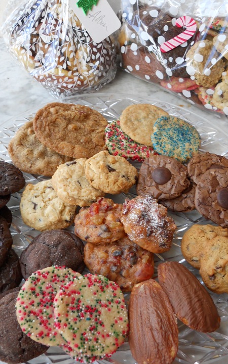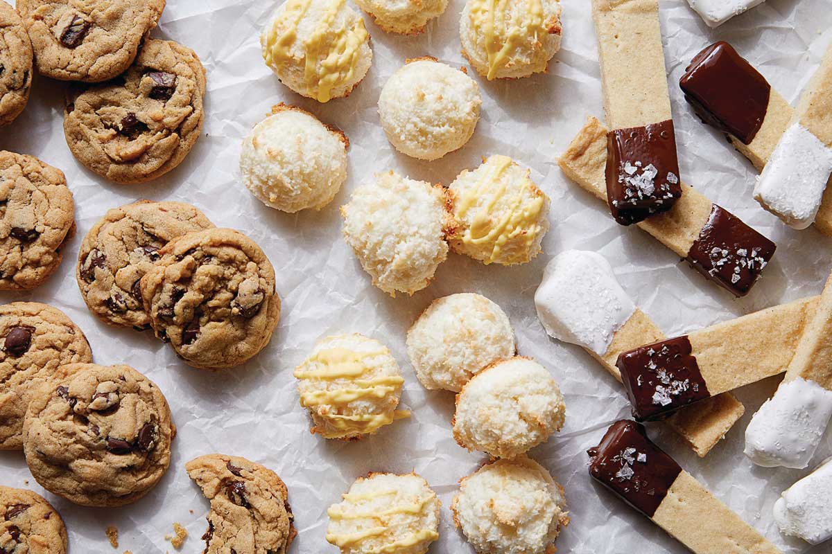 Clockwise from the top: Salty-Sweet Butter Pecan Cookies, Vanilla Dreams, Fudge Drops, Chocolate Chip Cookies, Vanilla-Scented Madeleines, Magic in the Middles, Flourless Fudge Cookies, and Fruitcake Drops.