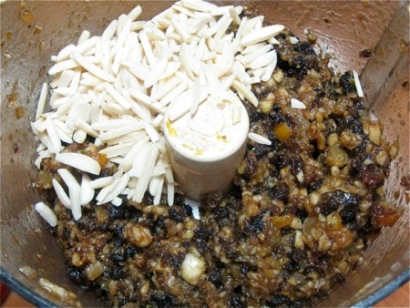 Add 2/3 cup (71g) slivered almonds. Process briefly, just to break up the almonds.