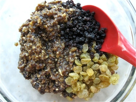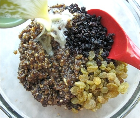Transfer the mixture to a bowl. Add a scant 1/2 cup (67g) golden raisins, and 1/3 cup (43g) currants.