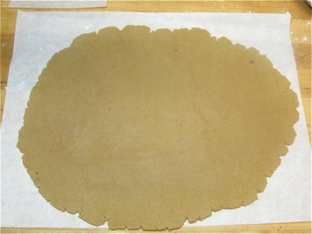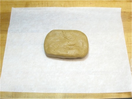 Take one piece of dough out of the refrigerator, and place it on a piece of half-sheet parchment (16 1/2” x 12 1/4”).