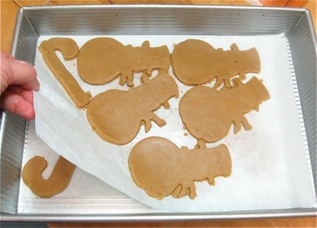 Cut out cookies, removing and saving the dough between them. You'll re-roll and cut these scraps.