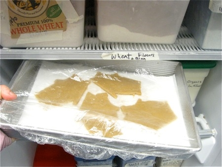 Next, cover the pan with plastic wrap (or a shower cap), and place it in the freezer. Once the cookies are frozen, you can leave the pan in the freezer; or, to save space (and get your pan back), remove the pan from the freezer, quickly peel the cookies off the parchment, and store them in a zip-top bag.