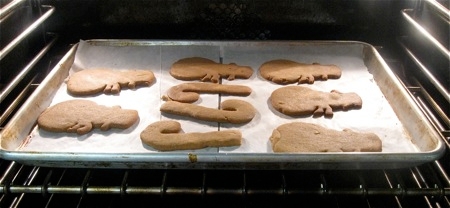 As you continue to roll out dough and cut cookies, lay the sheets of cookies into a 9” x 13” pan. Continue until you've used all the dough.