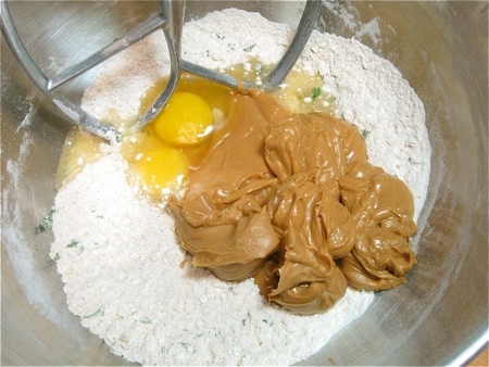 Add 2 large eggs and 1 cup (269g) peanut butter, crunchy or plain.