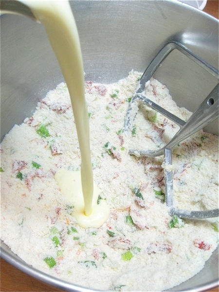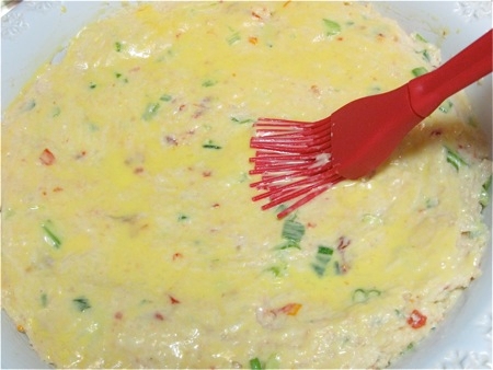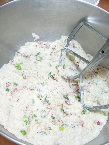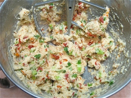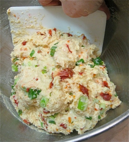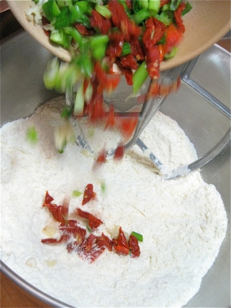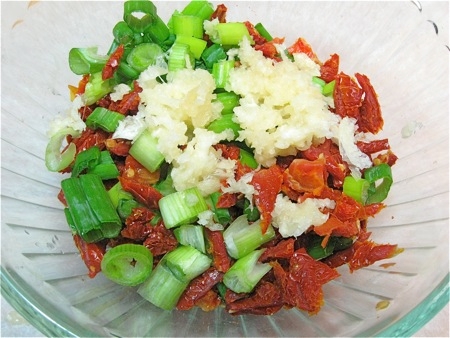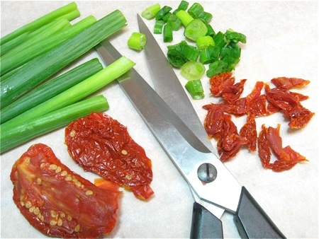 Prepare 1/2 cup finely chopped scallion tops, chives, or green bell peppers; and 1/2 cup finely chopped sun-dried tomatoes, iced red bell peppers, or diced pimientos. Here, I'm using scallions and sun-dried tomatoes.