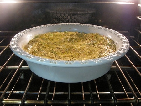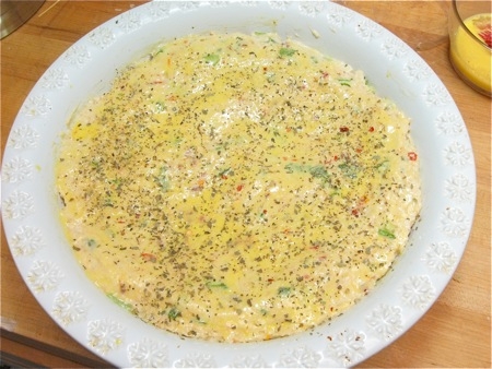 Using your wet fingers, smooth it to the edges of the pan. Make it a tiny bit concave, so the edges are just slightly higher than the center.