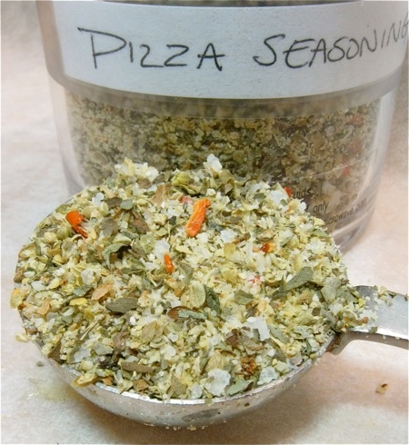 Now here's one of my go-to ingredients, for all manner of pizzas and Italian breads: pizza seasoning, a mixture of dried onion, garlic, herbs, spices and salt.
