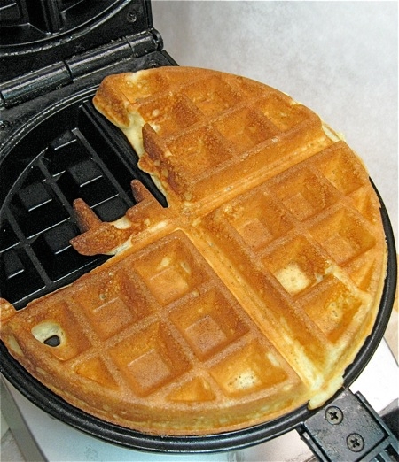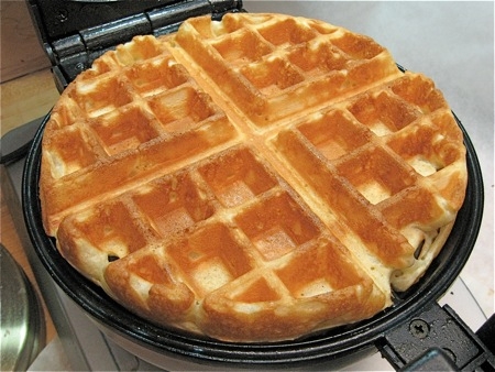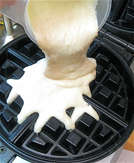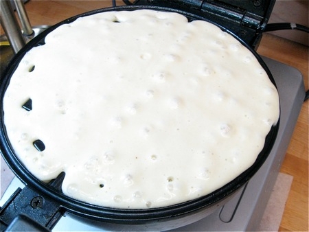 I'm using a deep-pocket Belgian-style waffle maker here; it's one of those flip models, the kind you'll often see at serve-yourself motel breakfast buffets. You pour in the batter, then rotate the iron 180° so the top becomes the bottom. Not sure why flipping the iron works, but it surely makes one heck of a light waffle.