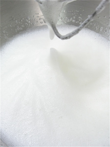Continue to beat till mixture is stiff and glossy. When you lift the whisk out of the whites, the peak will stand straight up, then gradually droop once the connection is broken.