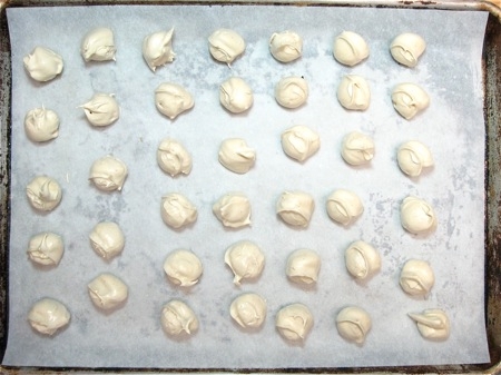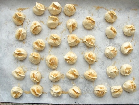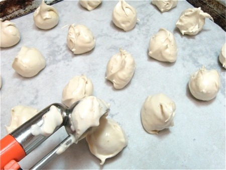 Drop the meringues by large teaspoonfuls onto the baking sheet. A teaspoon cookie scoop, dipped in water frequently, works well here.
