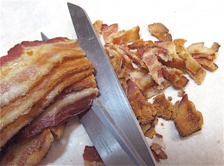 When the bacon has cooled enough to handle, chop it into 1/2" to 3/4" pieces; a pair of scissors is ideal for this task.