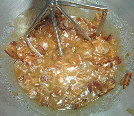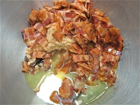 Let's start with the bacon; the recipe calls for half a pound. But I decided to cook an entire pound, since I figured I'd have to test the recipe at least twice. Which I did. Without protest.