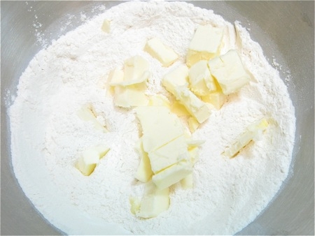 Add 4 tablespoons (57g) cold butter, cut in pats.