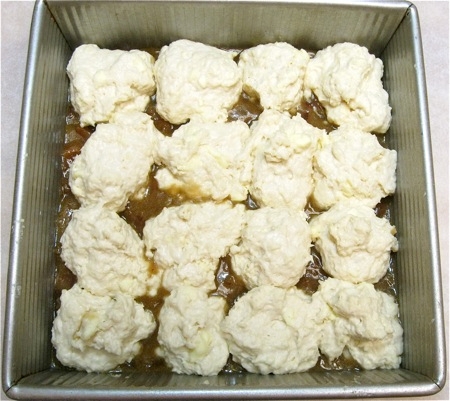 Drop the dough in heaping tablespoonfuls atop the syrup in the pan.