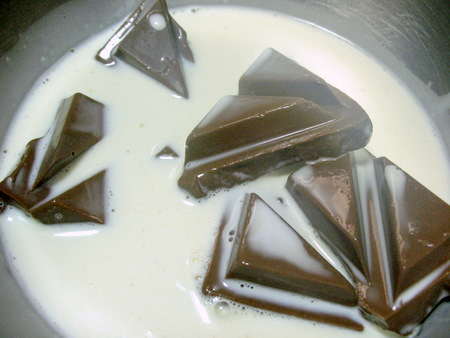 Melt 6 ounces of milk chocolate by pouring 113g (1/2 cup) of very hot heavy cream over it.