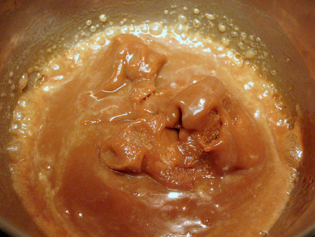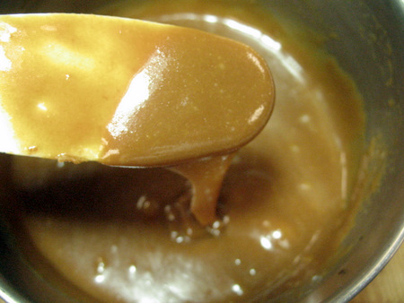 The caramel sauce will be thin and fluid, dropping easily off of a spoon. Set aside to cool slightly.