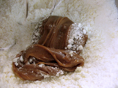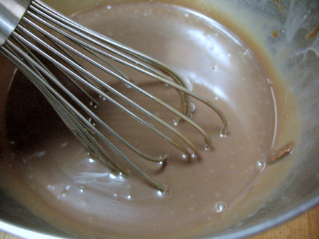 Pour in your cooled caramel. It should be slightly warm to the touch, but neither hot, nor cold and stiff. Like the little girl said, "It's just right."