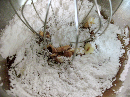 Hey, remember that chocolate ganache chillin' in the freezer? Take it out and whip it at high speed until it's light and fluffy.