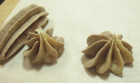 Practice piping a few lines or stars on parchment until you get a fairly even amount of each icing coming out at one time.