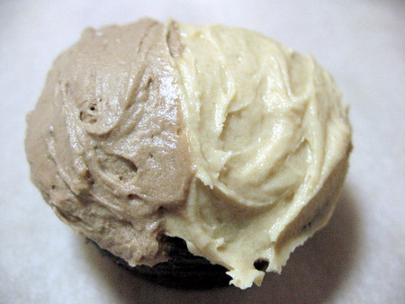 Using a pastry bag with a large tip, fill half the bag with the vanilla-caramel icing. Not half top to bottom, but half side to side. You'll be putting the chocolate icing next to it.