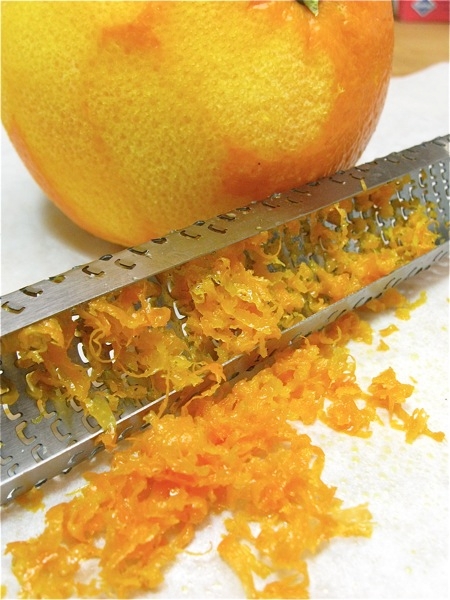 Next, we'll add the grated rind of 1 orange. Large orange? Small orange? Depends how much you like orange flavor.