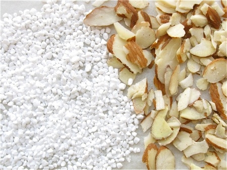 For a traditional topping, you'll need both coarse pearl sugar (left), and some kind of almonds (right). It doesn't really matter what kind, since you'll be grinding them.