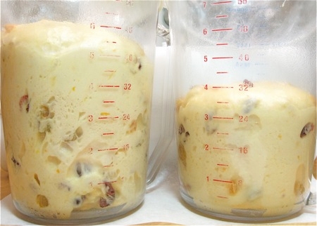 On the left, sweet dough raised with Yeast A. On the right, sweet dough raised with Yeast B. Same amount of time. Looks like about a 50% difference in rise, doesn't it?