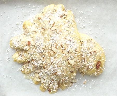 Sprinkle with 5 to 6 tablespoons coarse sugar, and 2 to 3 tablespoons sliced almonds.