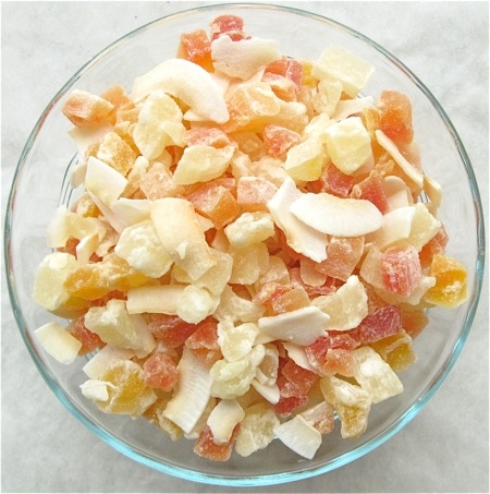Tropical fruit blend, with dried pineapple, papaya, mango, and big flakes of lightly toasted coconut, is a lighter-colored mixture.