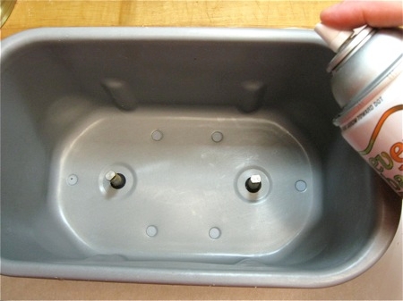 To prepare your bread machine: Remove the paddles from the bread machine bucket. Spray the inside of the bucket lightly with non-stick vegetable oil spray.