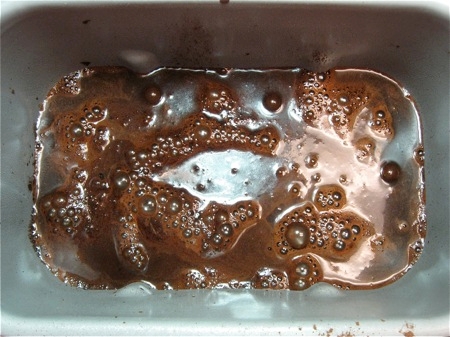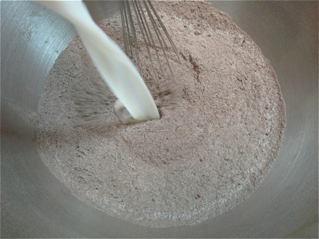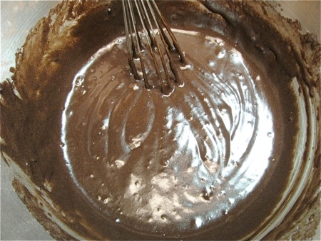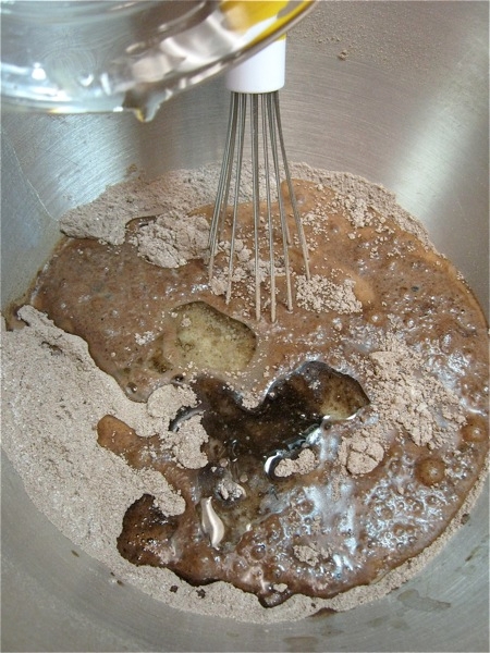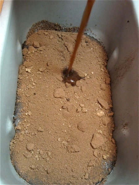 Drizzle 1 1/2 cups (340g) hot water or hot brewed coffee over the dry ingredients.