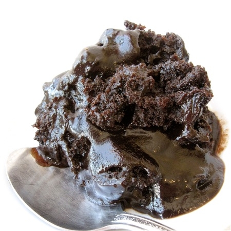 Let the cake cool for at least 15 minutes before serving. The sauce will thicken as it stands, and when totally cooled will be the consistency of medium-thick fudge sauce.