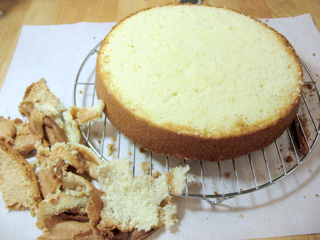 Now for the assembly. Remove the top browned layer of your cake to expose the soft absorbent cake inside. I'm sure someone will nibble up those crumbs, eh?