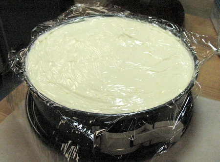 When you're ready to serve, remove the plastic wrap and run a thin, flexible spatula around the edge of the cake.