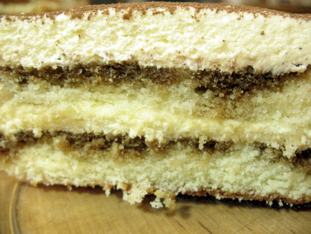 This cake does have the coffee flavor, but in a much more subtle way. You know there is coffee, but you also taste the sweetness of the cream, the vanilla in the cake, even the hint of marsala-like essence in the filling. Truly, a dessert to lift you up at any time of day.