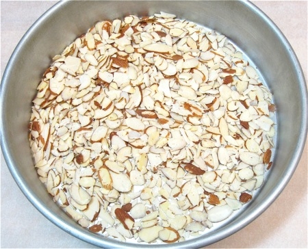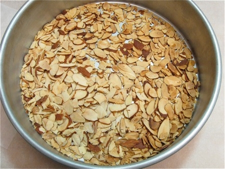 We'll start with the garnish. Put 2/3 cup sliced or slivered almonds in a pan. Toast them in your 350°F oven for 7 or 8 minutes...