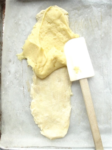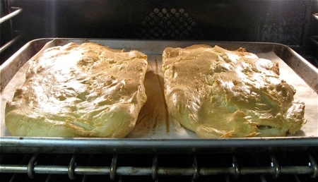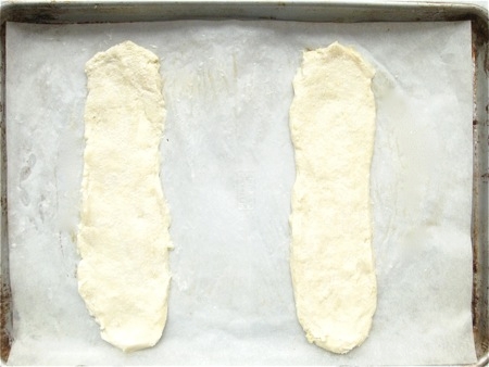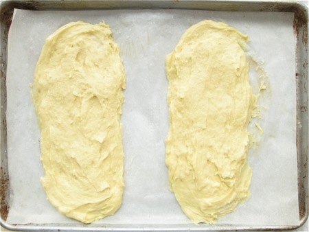 Pat each piece of dough into a 10” x 3” rectangle on a lightly greased or parchment-lined baking sheet. The pan should be large enough to hold both pieces of dough, leaving 3” on either side of each piece of dough, for expansion.