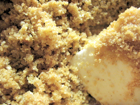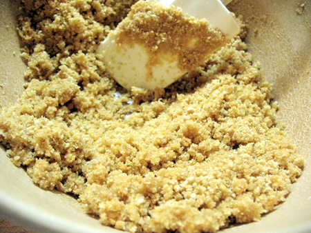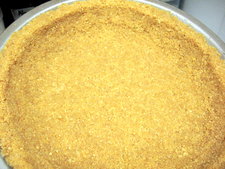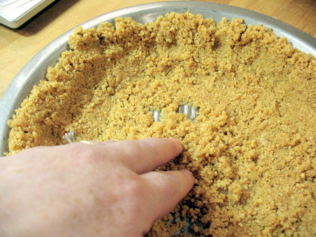 To ensure an even crust, brush the crumbs with your fingers to coat the entire bottom of the pan and up the sides. Don't press any of the crumbs down yet. First make sure all spots are covered evenly, then get to the pressing. This way you don't have to pry up an already pressed section to scoop out crumbs to over a bare section.