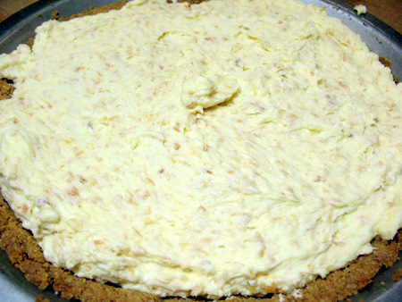 Spread the rich, thick filling into the baked and cooled crust. It should reach just to the rim of the crust.